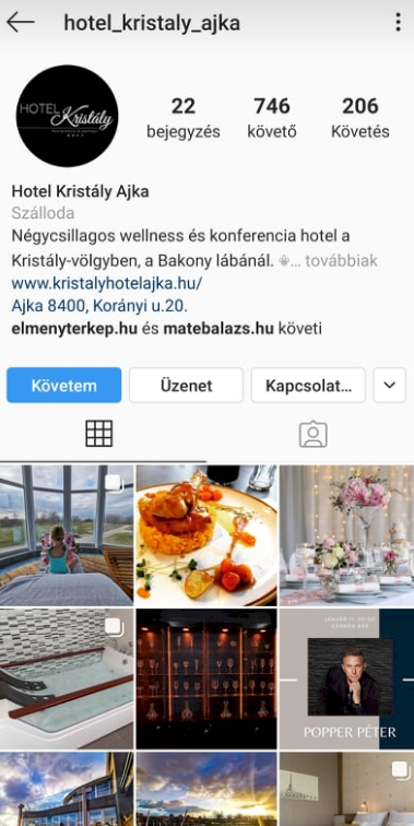 Az alábbi ábrán egy ajkai négycsillagos wellness szálloda bio-ját látod. Alig egy hónapja kezdtük el kezelni a szálloda Instagram marketingjét, egy helyesen beállított profilnak, a rendszeres és stratégiai oldalvezetésnek és a megfelelő hashtagek használatának köszönhetően ez idő alatt több mint 150 felhasználóval nőtt a követőik száma.