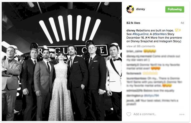 A kép a filmben megjelenő színészeket ábrázolja – láthatjuk többek között Felicity Jonest és Mads Mikkelsent is – meglehetősen sok csillagot sikerült egyetlen fotóba sűríteni, ami már önmagában garantálja az érdeklődést. Tovább fokozza a hatást, hogy a háttérben rohamosztagosok és más beöltözött karakterek is láthatók, mintha csak valahol a film díszletében készült volna a kép. A Disney megjelölte a @StarWars fiókot is, és persze a #RogueOne hashtag is megjelenik a mellékelt feliratban, ami biztosítja, hogy minél több rajongóhoz eljusson a kép. Mindemellett felhívják a közönség figyelmét, hogy az Instagram és a Snapchat történetekben további tartalmakra számíthatnak.