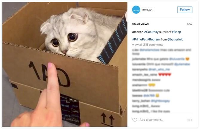 Habár az Amazon Instagram bejegyzése éppen egy újraosztás (vagy „regram”, ha úgy tetszik), az ilyen gesztusokkal azt bizonyíthatod, hogy a márkád odafigyel közönségedre, és hogy aktívan igyekszik kapcsolatba lépni az olyan tartalmakkal, amelyekben megjelölik. Az Amazonnak külön hashtagje is van (#PrimePet) az olyan márkával kapcsolatos tartalmakhoz, amelyekben házi kedvencek is feltűnnek.