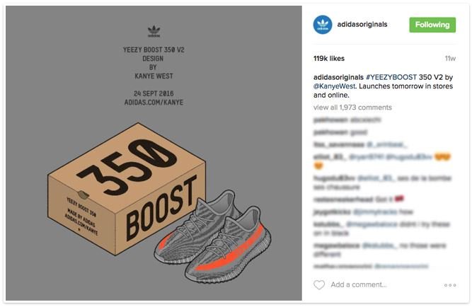Az Adidas tudja, hogy hogyan vezesse fel termékeit, és erre ez a bejegyzés is remek bizonyítékul szolgál. A kreatív képen a márka akkoriban újnak számító (másnap megjelenő) Yeezy Boost 350 V2 sportcipője látható stílusos ábrázolással, illetve a termék doboza is megjelenik. Habár kétségtelenül ezek a kép főszereplői, láthatjuk a termék megjelenésének dátumát, illetve a cipők saját landing oldalának rövid, könnyedén bepötyöghető hivatkozását is.