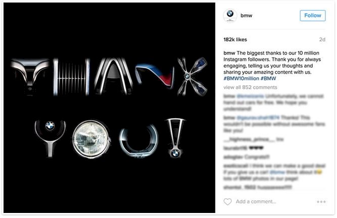 Ne feledkezz meg róla, hogy közösségi médiás sikereid csak részben szólnak rólad, hiszen a közönséged az, aki segít egyre nagyobbá és nagyobbá válnod – nélkülük sok márka sehol sem lenne. Na persze a BMW-nek nem az Instagram követők számán múlik a sikere, de mindenképpen nemes gesztus tőlük, hogy köszönetet mondanak rajongóiknak. Tégy te is így!