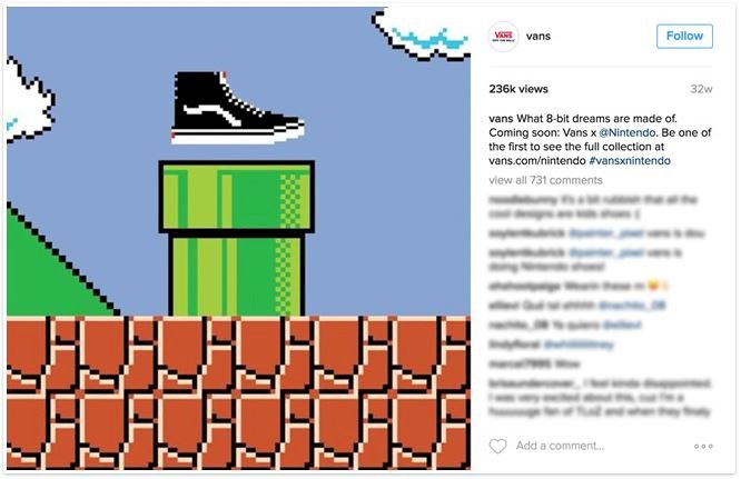 A kampány részeként a Vans egy videót töltött fel YouTube fiókjára, amiben a Mario jellegzetes grafikájában jelent meg egyik lábbelijük, ami a két márka együttműködésének kreatív szimbólumaként szolgált. Kreatív és egyedi jellege miatt a bejegyzés úgy helyezi a középpontba a terméket, hogy nem viszi túlzása annak promócióját. A videó persze a Nintendo Instagram fiókjára is felkerült, és a két márka természetesen egymást jelölte meg a mellékelt feliratban. Természetesen releváns hashtag is készült a kampányhoz, és még egy könnyedén megjegyezhető hivatkozás is került a leírásba a kampány landing oldalához.