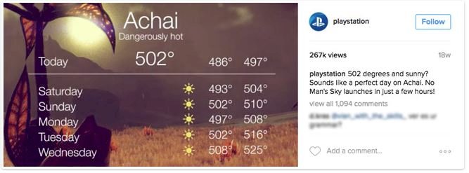 A No Man’s Sky című videojáték kiadása előtt a PlayStation egy nagyon kreatív képet osztott meg Instagram profilján. A kép egy sokak számára ismerős felhasználói felületet ábrázolt (az iPhone telefonok időjárás alkalmazásáét), ami éppen azt mutatta, hogy hogyan is nézne ki egy előrejelzés a játék egyik bolygóján.