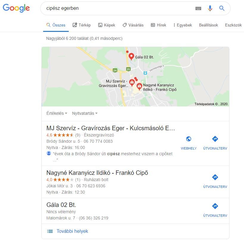 Ha például beírod a Google-ba, hogy „cipész Egerben”, akkor a Google a következő találatokat jeleníti meg: