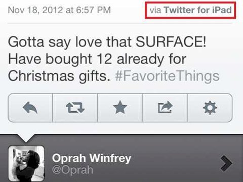 A probléma az volt, hogy a Twitter látta, hogy a bejegyzést egy iPad készülékről (a Microsoft versenytársának, az Apple-nek a terméke) írták, és ez nyilvánosan meg is jelent a tweet jobb felső sarkában. Nem túl őszinte, ugye?
